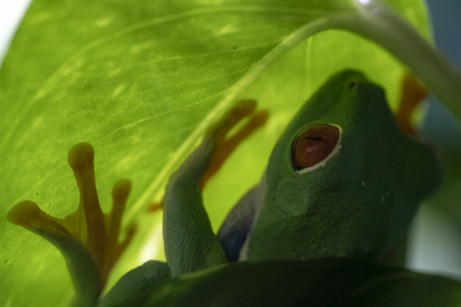 深紅の美しい瞳が特徴的なカエルですが、日中は瞼を閉じて寝ていることもしばしば。
