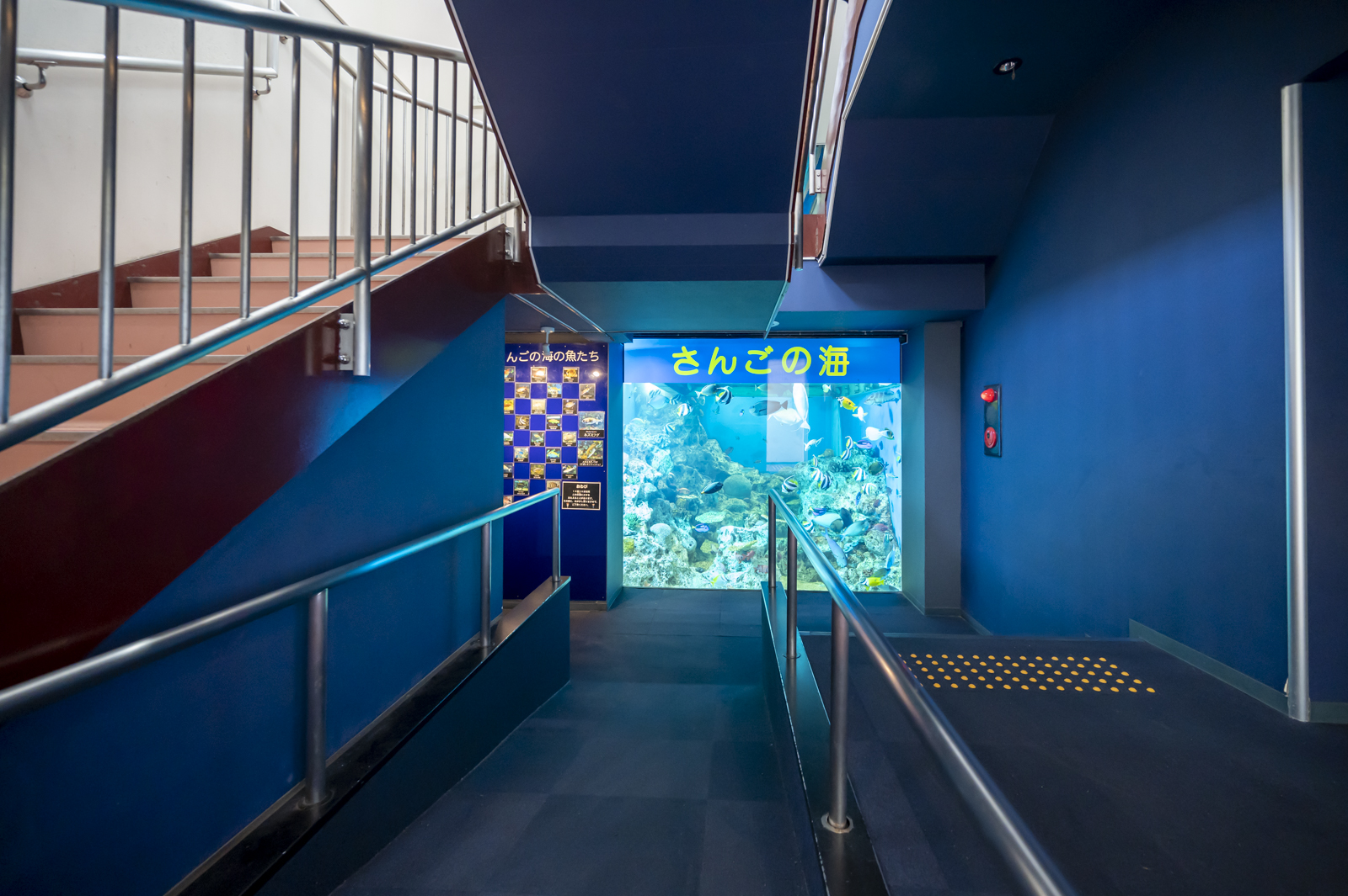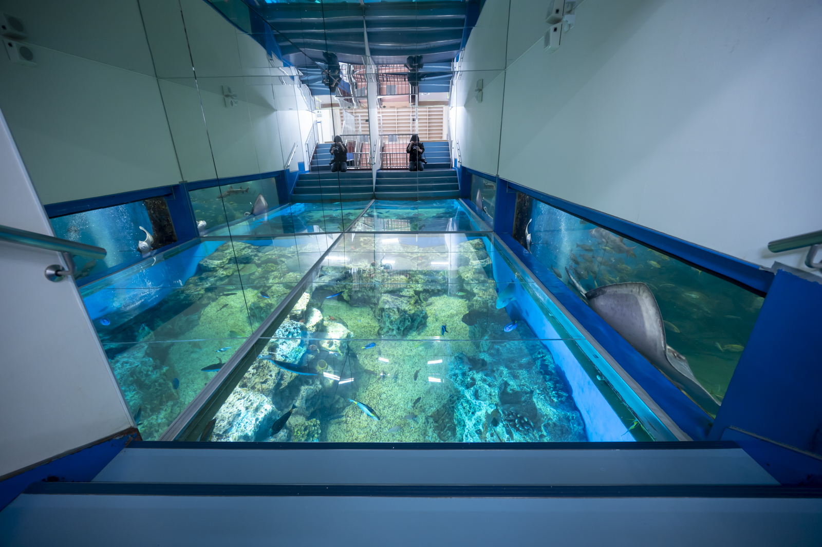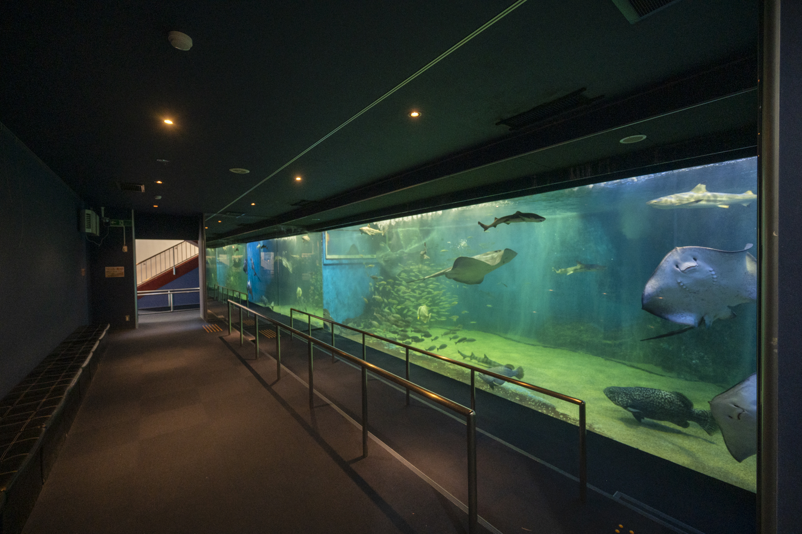 越前松島水族館の名スポットのひとつが、「海洋館」2階にある、水面ガラス張りのシースルー水槽。