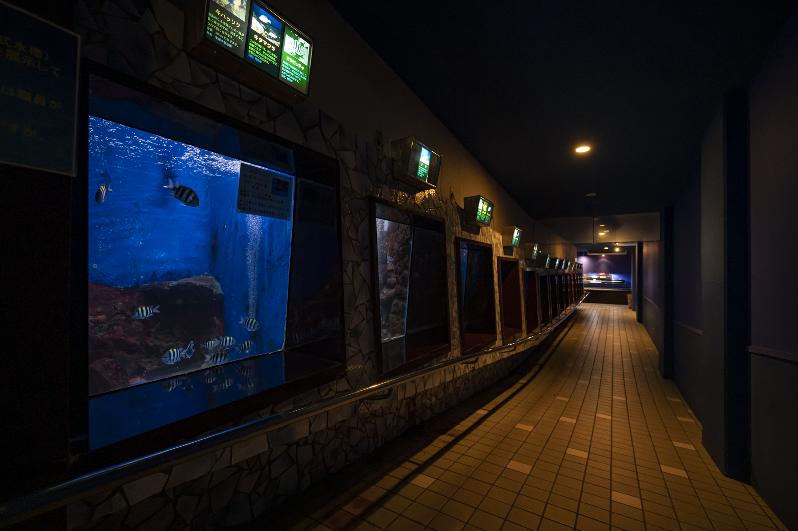 誰もいない館内、ちょっとレトロな汽車窓水槽群。
