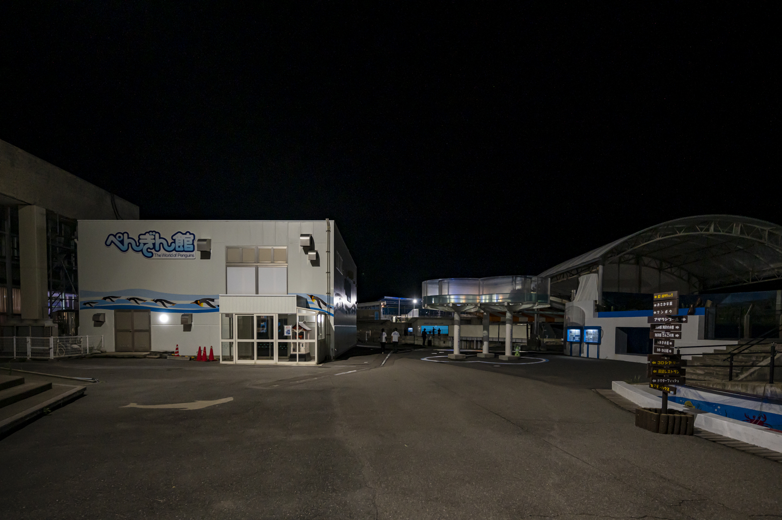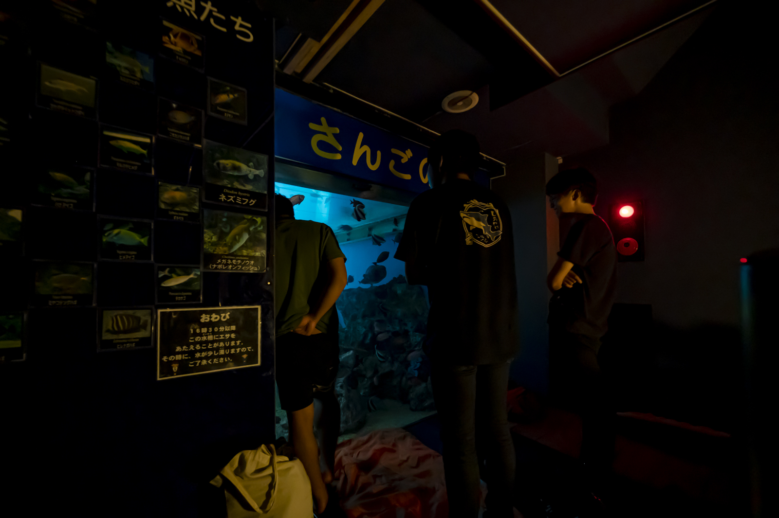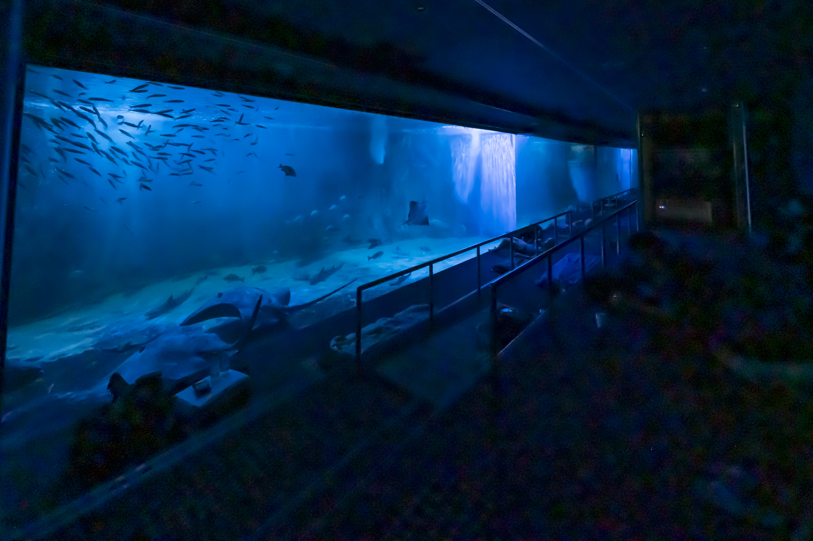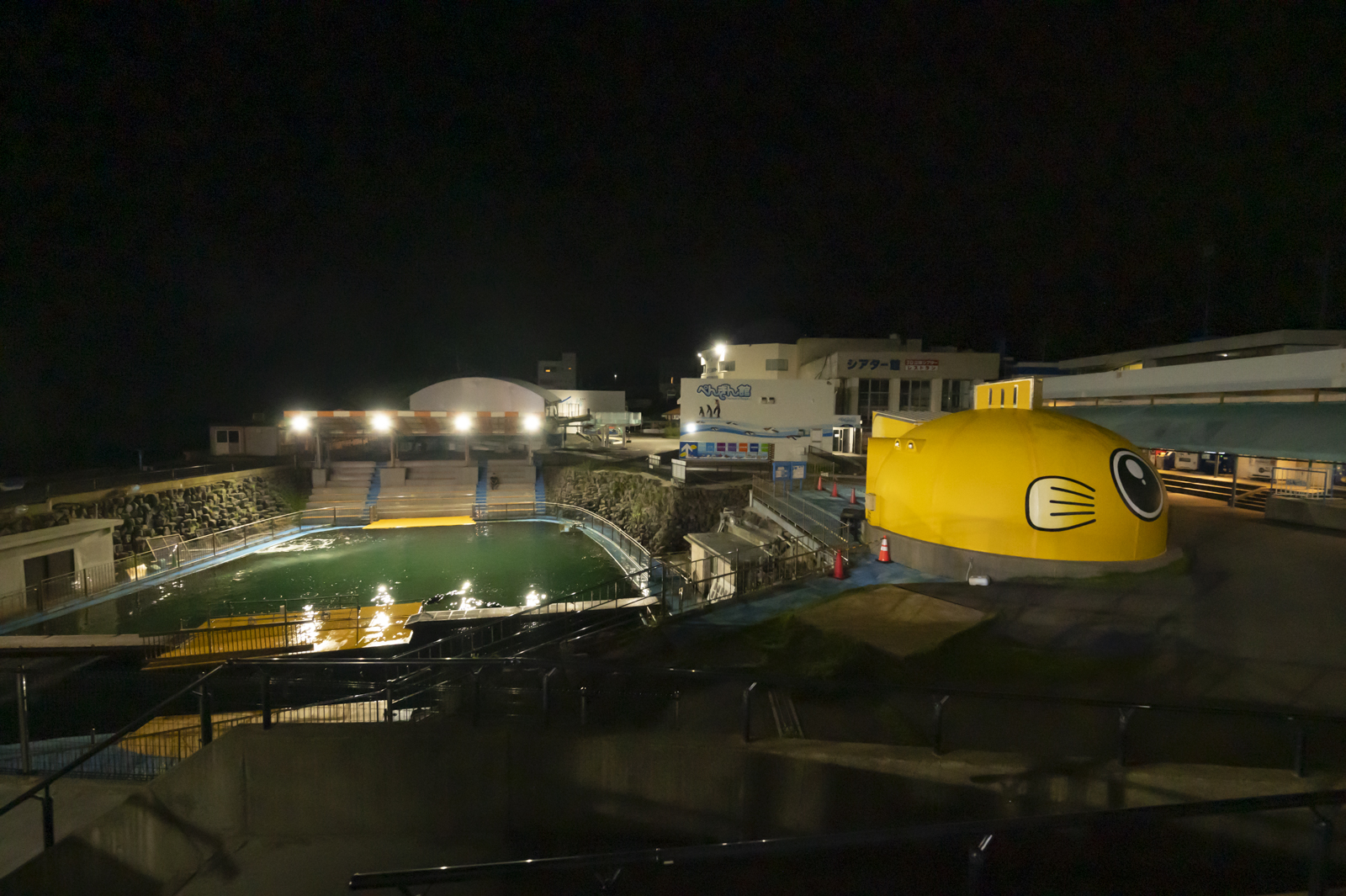 日帰り入浴を済ませて20時ごろ水族館に戻ると、すっかり夜の世界。