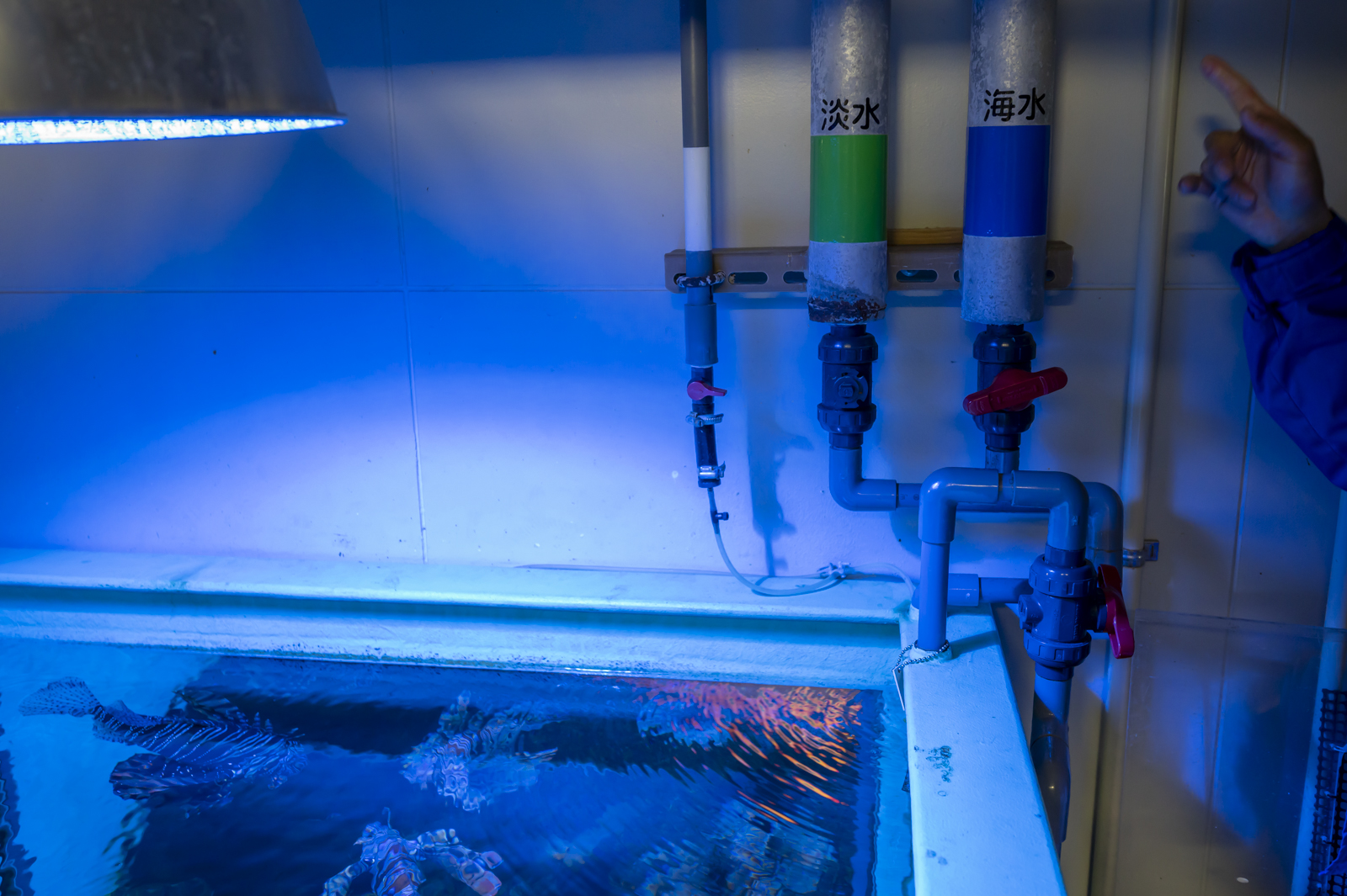 ミノカサゴの水槽を上から眺めながら、「水槽の水の話」について教えてもらいました。