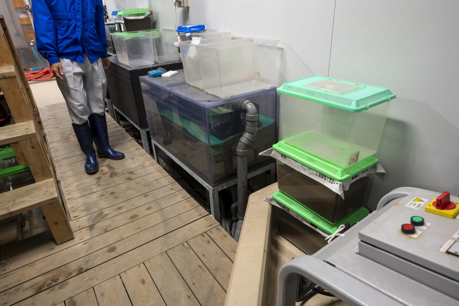 ところで気になるのが、水槽以上に目立つ大量のプラケース。中には水ではなく土が入っていて、明らかに魚以外のものが飼われています。
