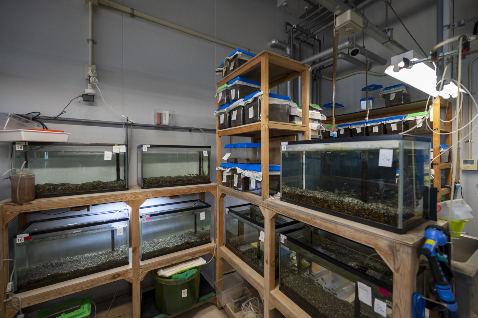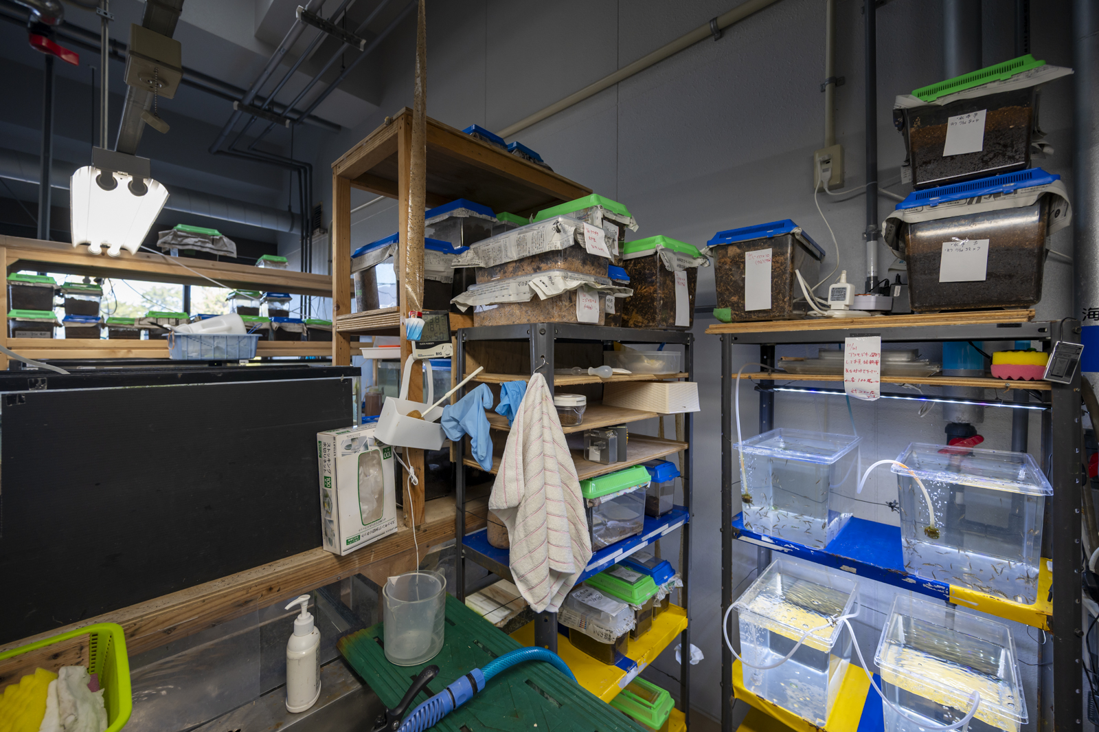 市販の規格水槽がズラッと並ぶ小部屋。