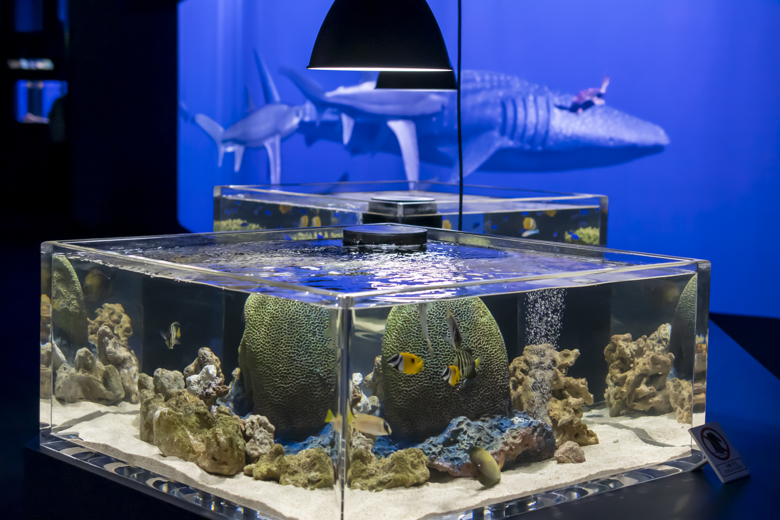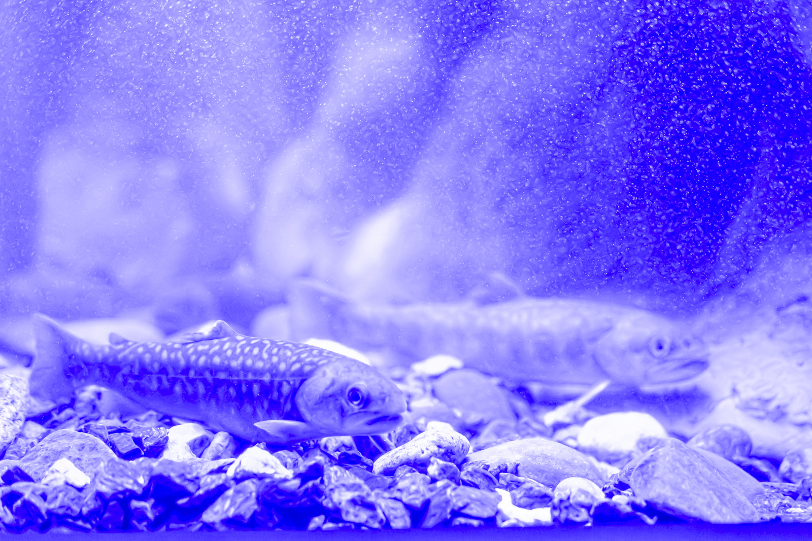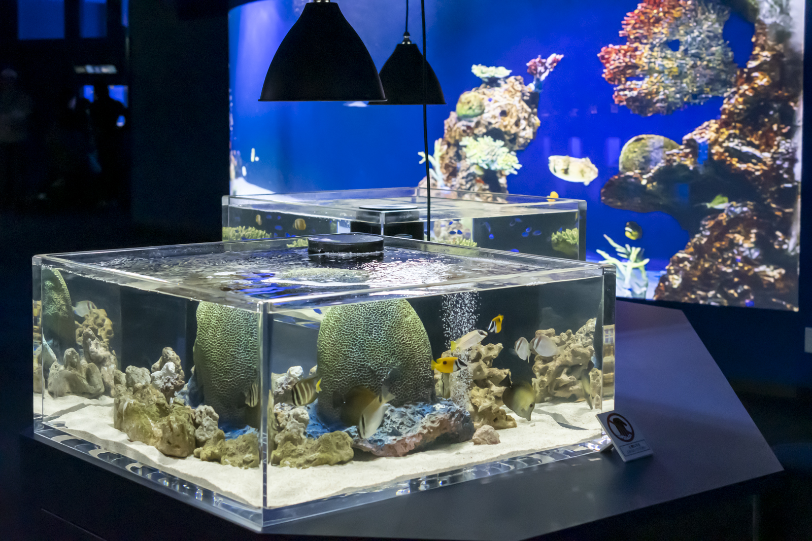 水槽の真ん中だけが白色光で、両サイドは完全に青照明。写真で見返すとなおさらツートンカラーが目立ちますね……。