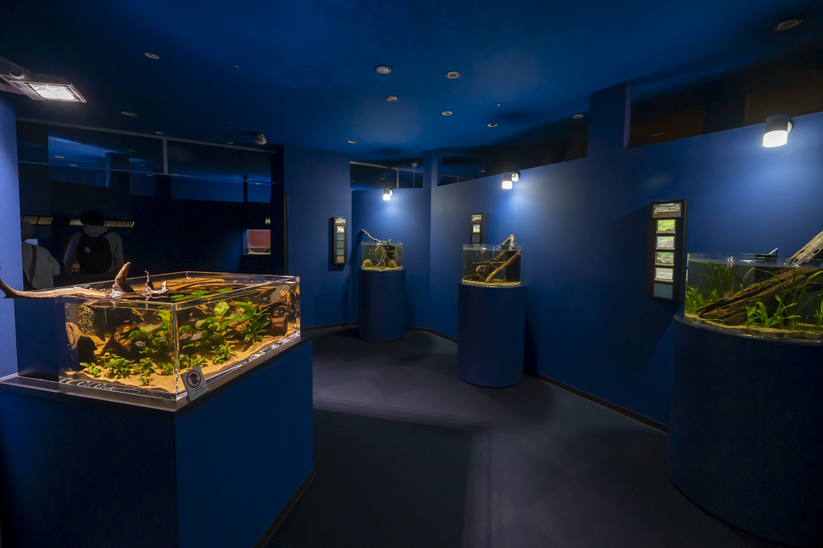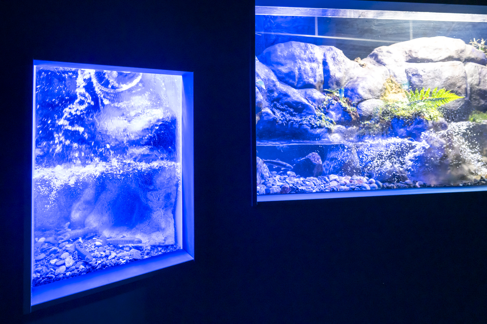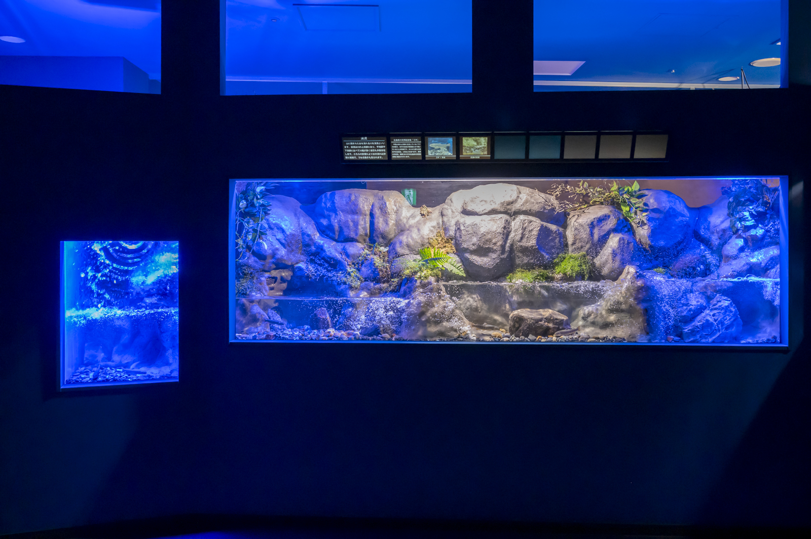 特に左横の滝つぼ風の水槽は完全に真っ青で、これもちょっとびっくりしたポイント。