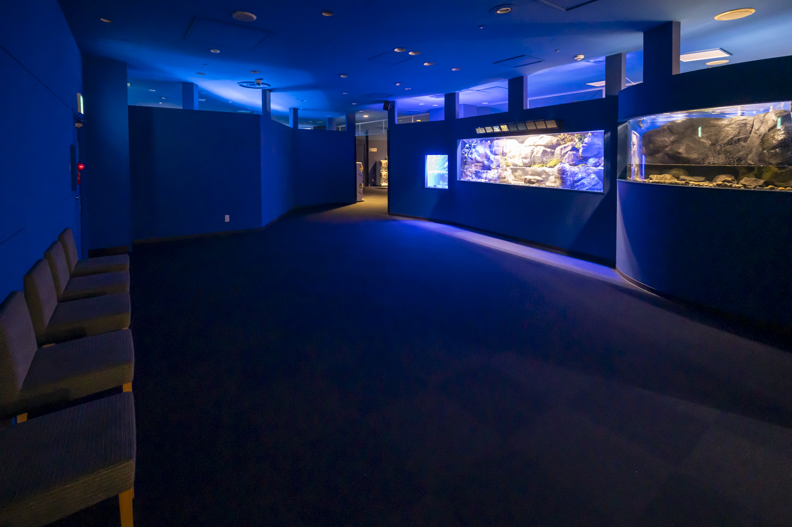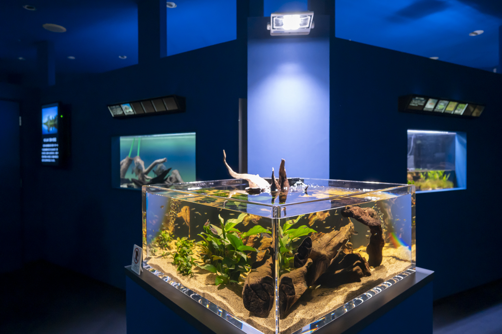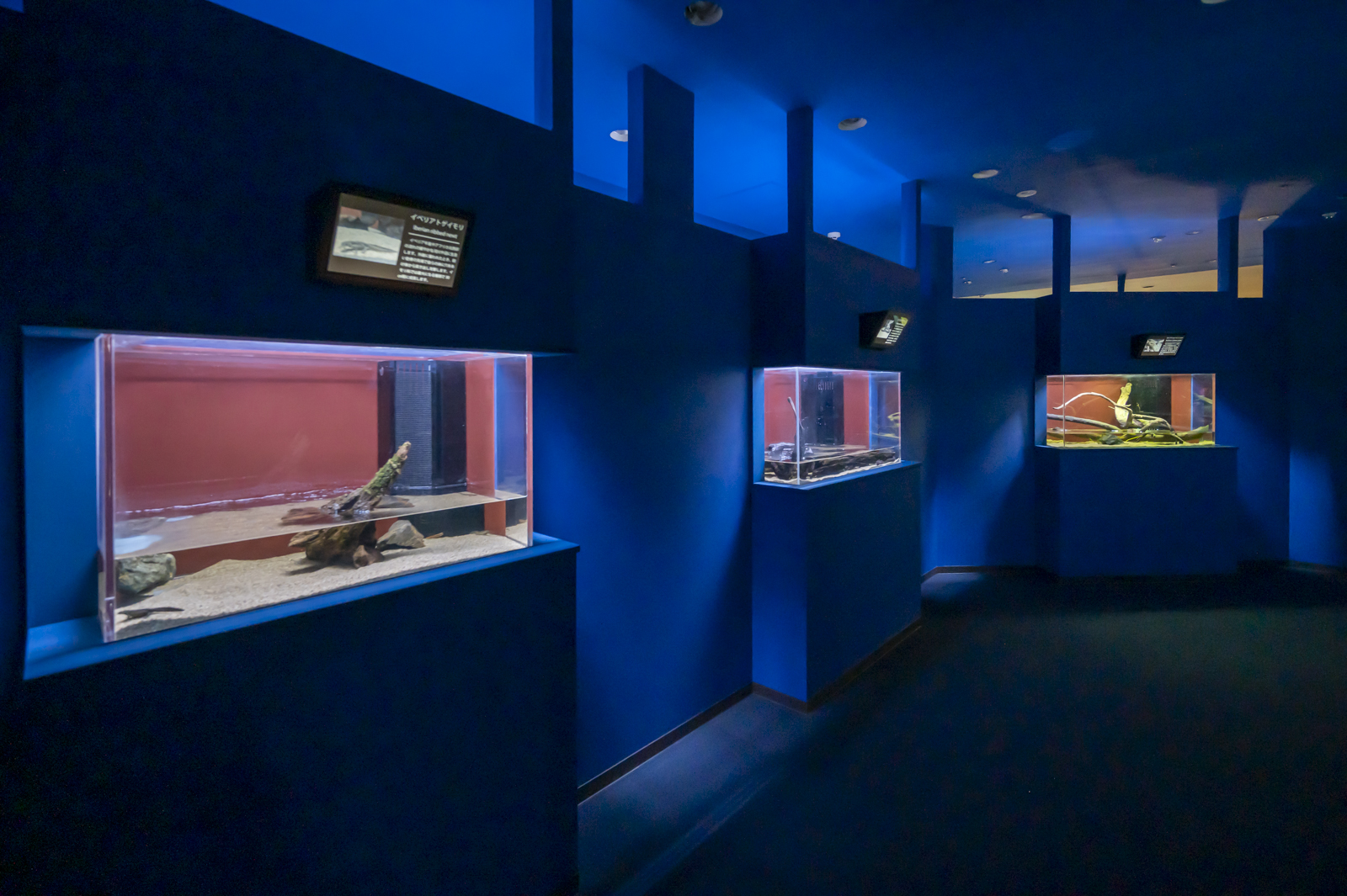 特に左横の滝つぼ風の水槽は完全に真っ青で、これもちょっとびっくりしたポイント。