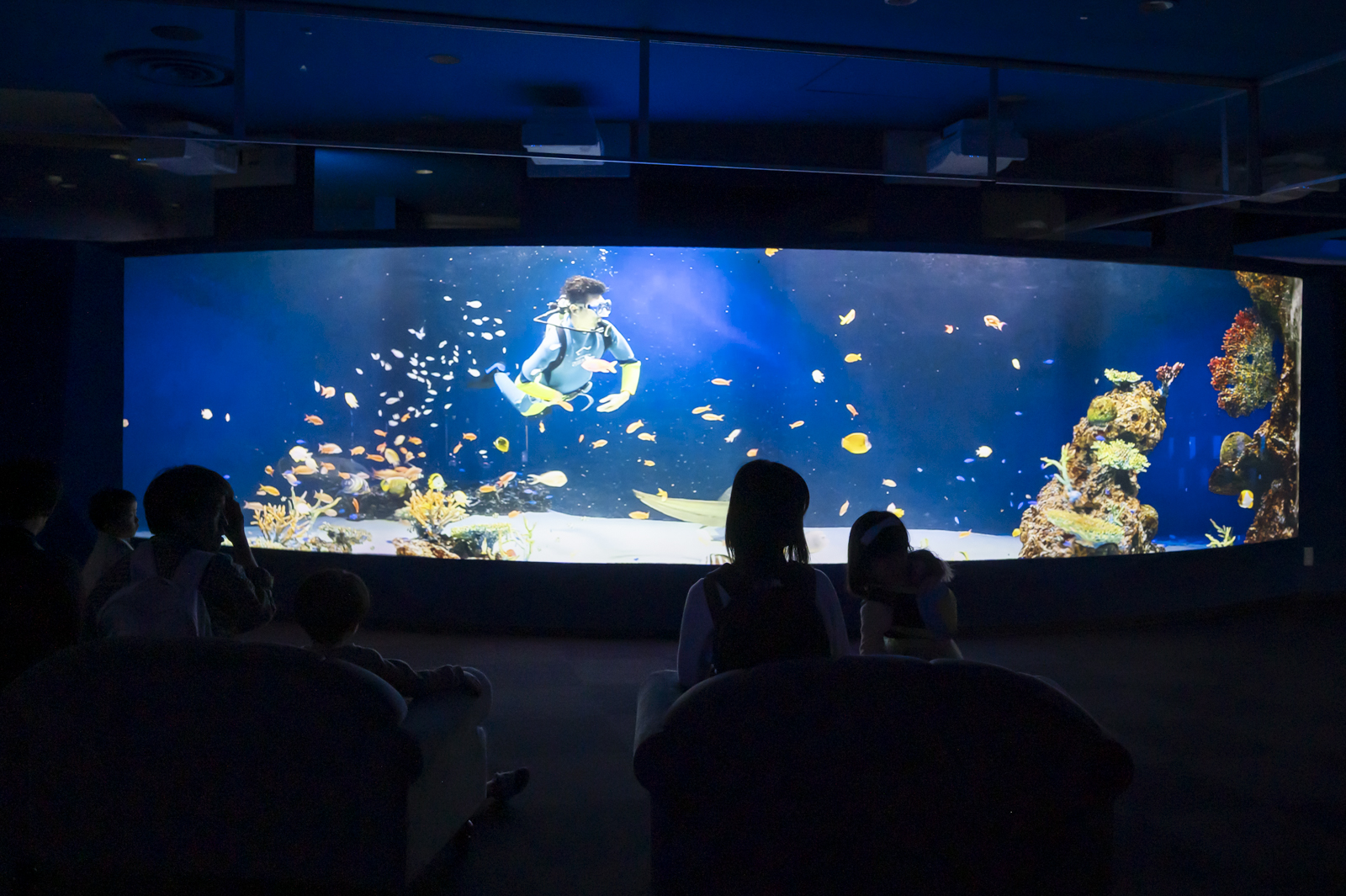 湾曲した壁面に「旧マリホ」時代の大水槽の映像を投射しています。「本物の大水槽か?」と一瞬思ってしまうくらいに鮮明な画質でしたし、スクリーン前のソファで懐かしそうに見入る人が多かったのも印象的でした。