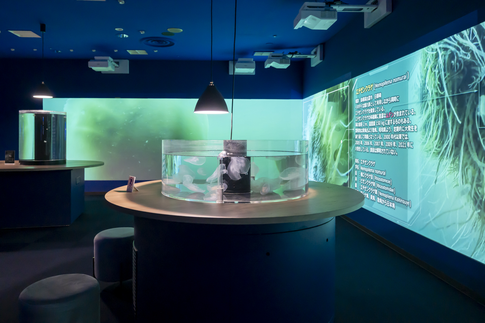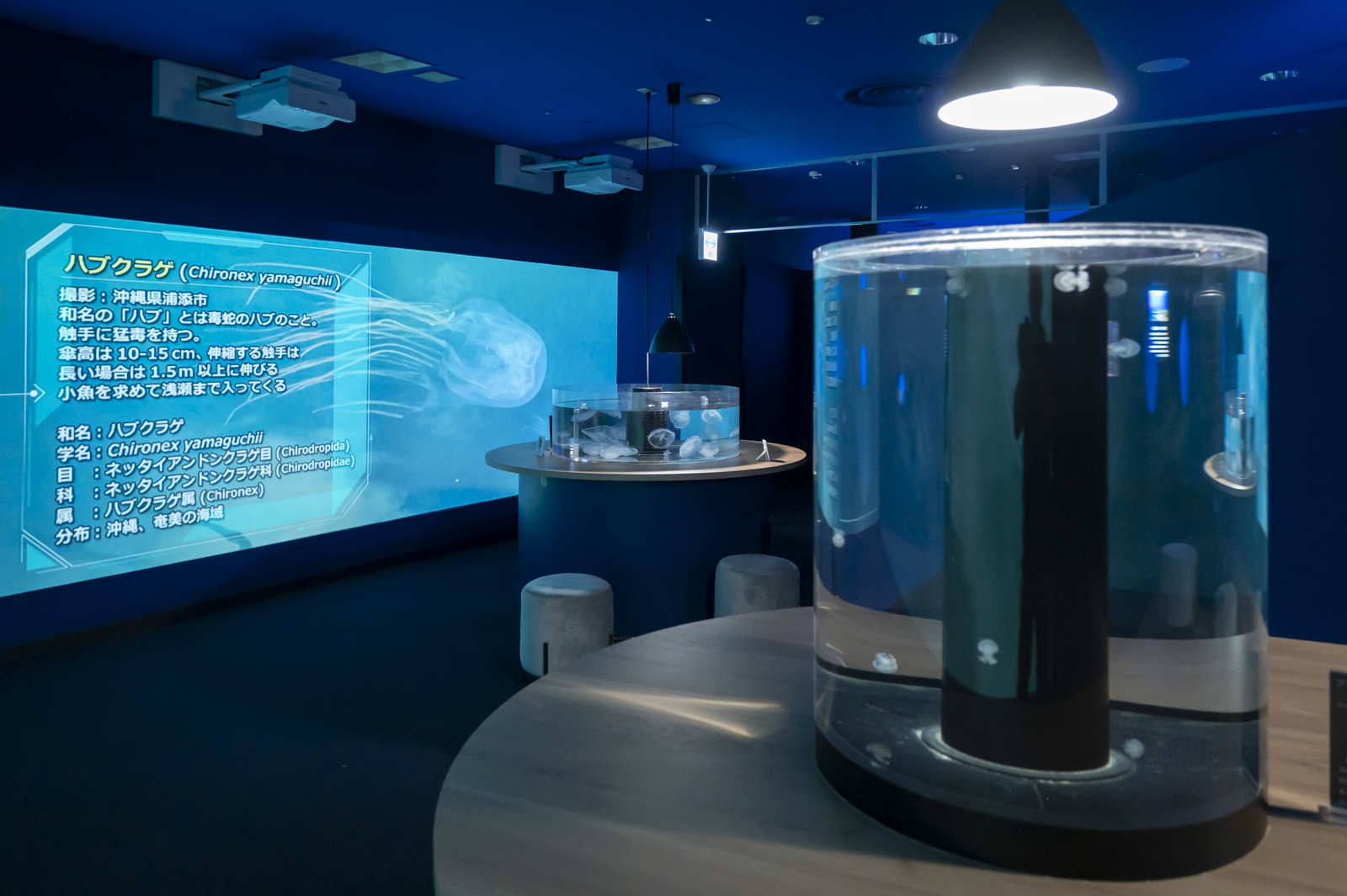 クラゲコーナーは壁面をプロジェクションマッピングに活用しているのと、テーブル上に円柱型のクラゲ水槽があるのも特徴的。
