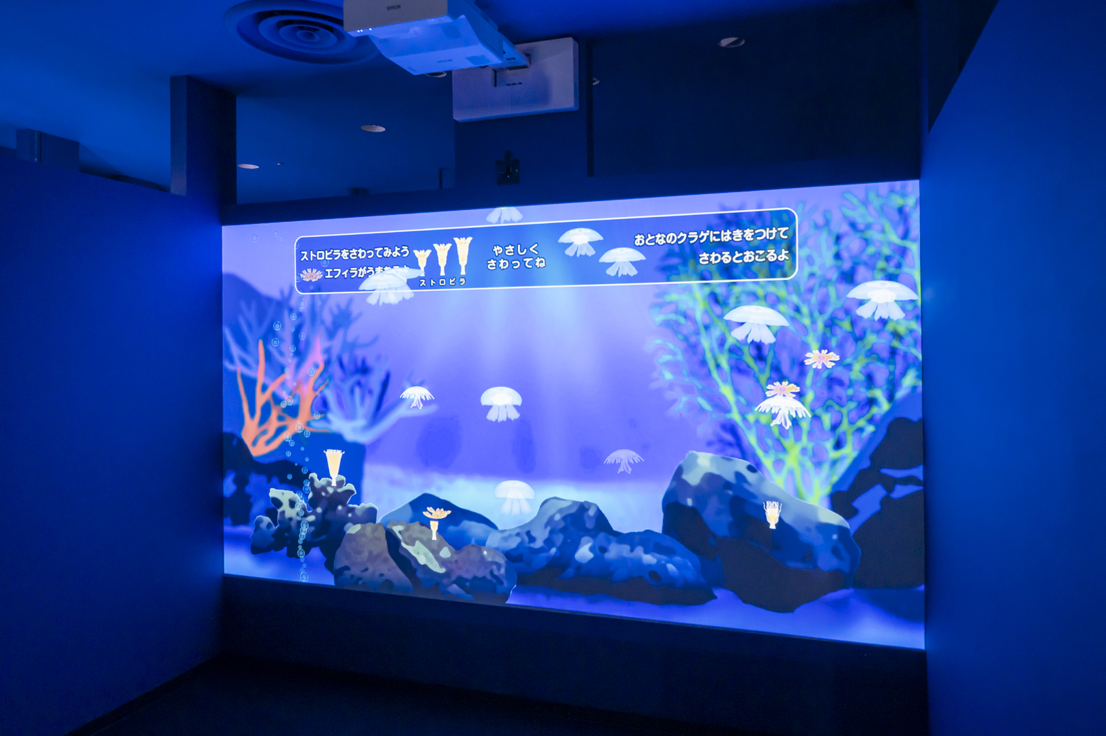 少し離れた場所には、ゲーム形式でクラゲの生活環を学べる映像展示もありました。