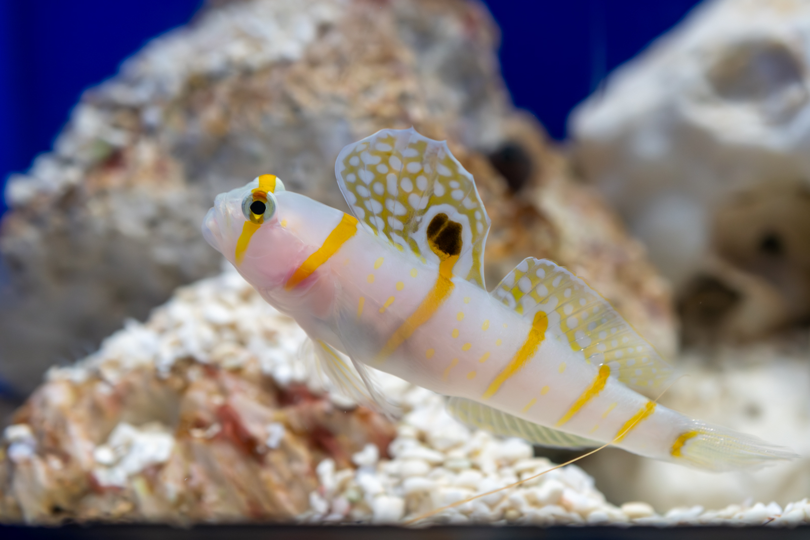 写真はニチリンダテハゼ。テッポウエビと同じ巣穴で暮らす「共生ハゼ」の一種。
