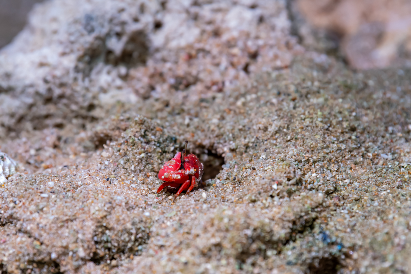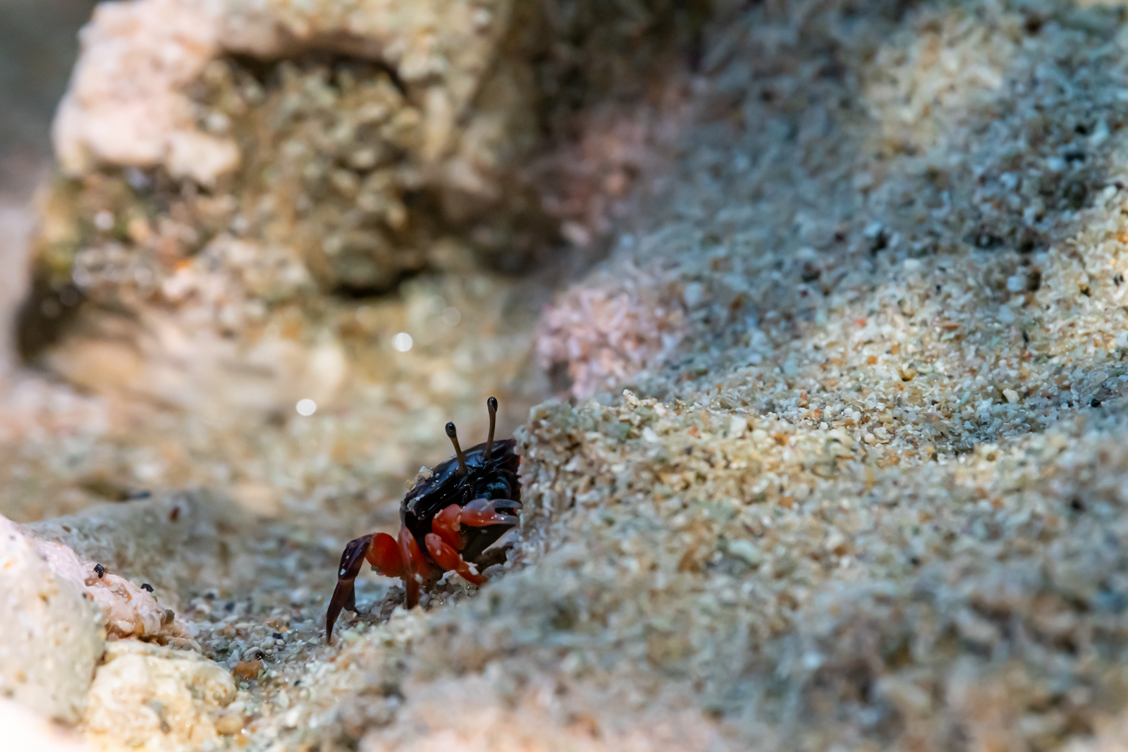 マングローブ水槽では、ベニシオマネキが巣穴に隠れずに行動中。日中帯と比較したわけじゃないけど、彼らも館内が賑やかになると隠れてしまいそうな生体だなあ。