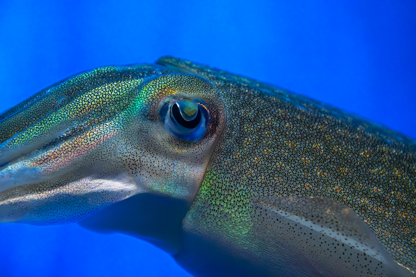 興奮すると目まぐるしく体色を変えるイカ。間近で張りついて眺められるのも、館内が空いているからこそ。